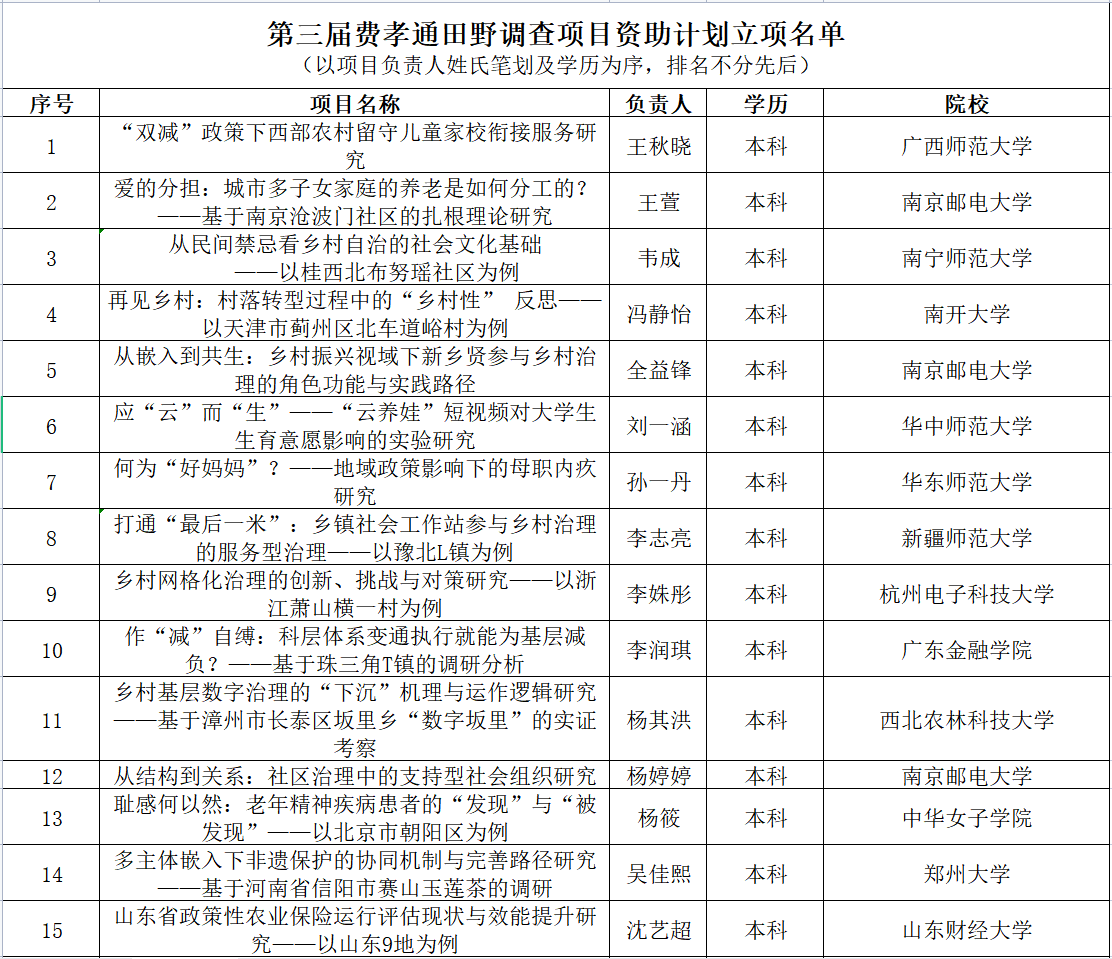 “第三届费孝通田野调查项目资助计划”评选公告自2023年5月发布以来,共收到来自南开大学、浙江大学、中国农业大学等100余所高校200余项申报材料,共同角逐30个名额。公司社会工作专业21级本科生韦成、罗媛媛、黄芷钰三位同学共同完成的作品参加评选。